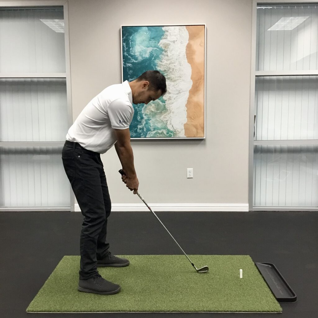 This is commonly seen as the golfer addresses the ball, and is characterized by a rounded upper back. The mechanical dysfunction we find clinically in these players is a significant lack of thoracic spine extension (likely due to the presence of one or more of the 4 T’s), but we also commonly see an inability to properly hip hinge during address. C-posture contributes to a significant loss of spinal rotation, thus limiting the ability to turn freely in the golf swing.