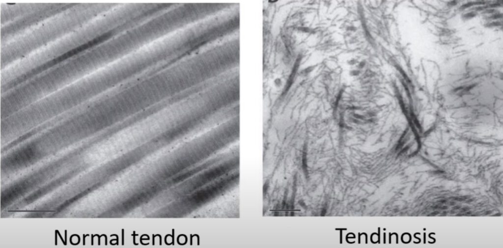The body heals a tendon by laying down type 3 collagen fibers (the fibers on the right picture). This is a weaker less durable fiber that requires eccentric loading exercises to mature and remodel into stronger type 1 collagen fibers (the fibers on the left picture). Photobiomodulation has been shown to stimulate tendon cells (tenocytes) to produce type 1 collagen (strong organized collagen fiber) vs type 3 (weak disorganized collagen fiber) in tendon degenerative states. This process accelerates recovery and provides stronger tissues.
