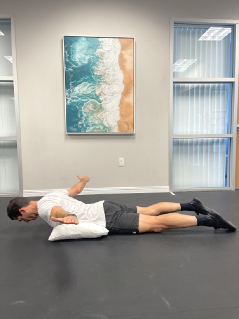 - Isometric scapula ‘T’ stabilization – lie on your stomach, supporting your low back with a pillow, and your head and neck with a towel. Lift your arms out to the side, pinching your shoulder blades together. Keep your elbows locked out. Don’t shrug your shoulders up towards your ears. Hold this position for 30 seconds to 1 minute.
