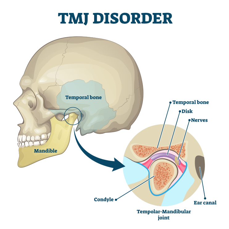 The TMJ consists of the mobile mandible and the relatively fixed temporal bone. Between these two bones is a disc. Ideally, this disc enhances joint stability and mobility. There are times when the disc stops functioning properly and may cause pain and impair the joint mobility. For example, it may limit mouth opening. Surrounding the joints are the ‘muscles of mastication’, or chewing muscles. These include the masseter, temporalis, and pterygoids. In cases of overuse or misuse, these muscles can become dysfunctional and painful. Examples of overuse or misuse include clenching, grinding, and excessive gum chewing.