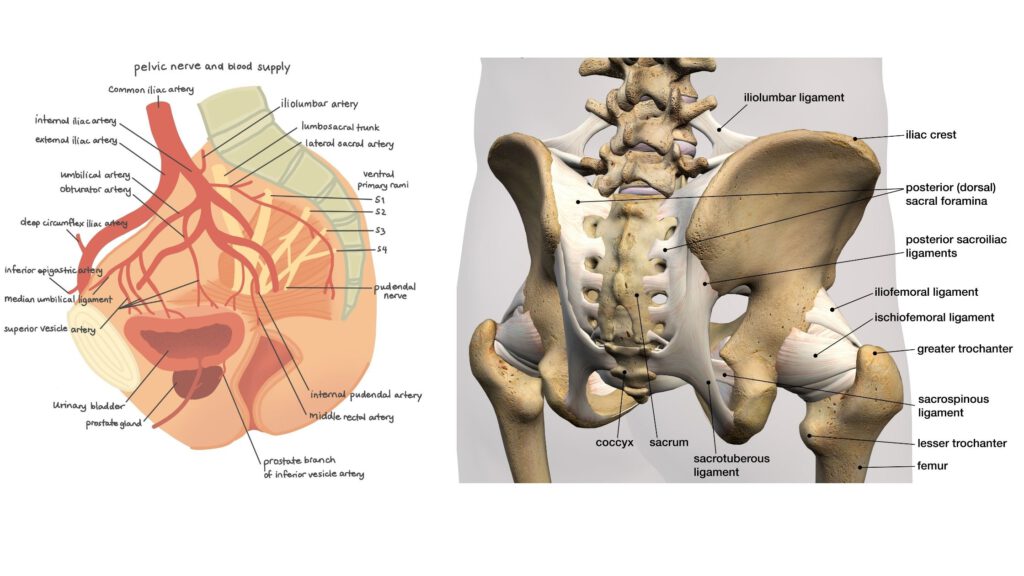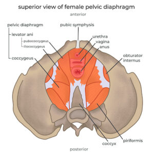 As you can see in the picture, your pelvic floor is a hammock that runs from your pubic bone back towards your tailbone. There are three layers of muscles, some that are more superficial and others that are deep. In addition to muscles, there are also ligaments that attach to various bony landmarks around the pelvis to provide added support and stability. There are also a number of nerves that run through the pelvic region that provide innervation to the muscles in this area.